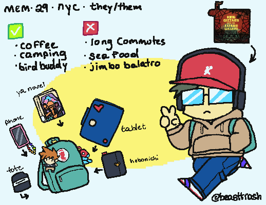 Hello I'm Memphis (You can call me Mem!)I'm a fan artist located in NYC. I'm a big fan bright colors, fluff and cute creatures.I'm currently really into Pokemon, but I also enjoy One Piece and Ace Attorney!I also like BL, GL, and trans characters. If that ain’t up your alley, i respect that! But please don’t bother me about it.I do not take commissions.However, I take small doodle requests on my Strawpage if you ask kindly and they aren't NSFW.If you have any questions feel free to check out my FAQ below, or put it in the chat box!You can find me on Bluesky or Tumblr posting art and fic. See you on the flip side!~